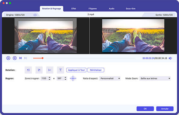 Rotation & Rognage comprend la fonction Faire pivoter et la fonction Rogner.