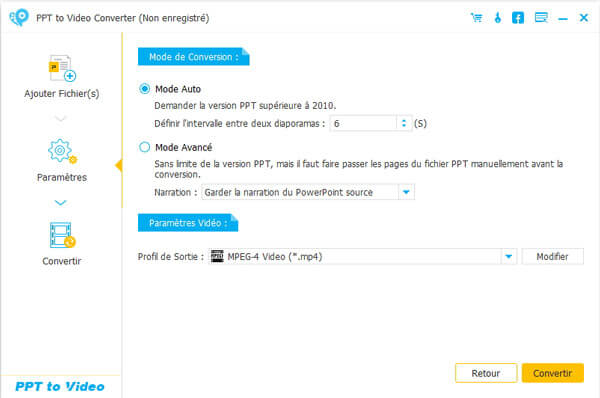 Vous devez régler les paramètres en fonction de vos besoins personnels en convertissant les modes et les paramètres vidéo. Cliquez sur “Convertir” pour convertir PowerPoint en vidéo.