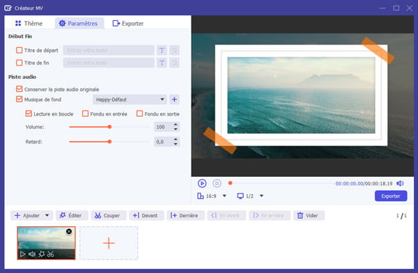 L'onglette « Paramètres » vous permet d'ajouter un titre de début et de fin à votre vidéo, ajouter une musique de fonction et d'ajuster le volume de la musique. Vous pouvez aussi choisir de conserver ou non la piste audio originale.