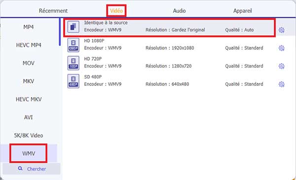 Une fois déroulé le menu de la liste des formats disponibles, placez-vous dans l'onglet "Vidéo". Dans la liste côté gauche cliquez sur "WMV". Ensuite, dans la colonne droite, cliquez sur "Identique à la source".