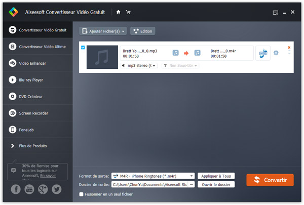 Sélectionnez "M4R" de "Format de sortie" et cliquez sur "Convertir" pour commencer à convertir MP3 en M4R sur votre ordinateur.