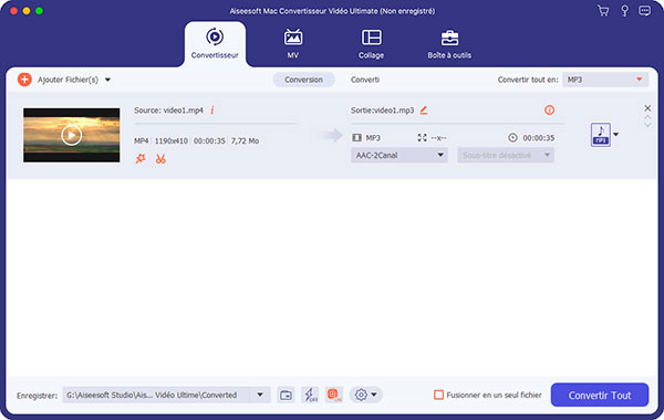 Convertir un fichier MP4 en MP3 sur Mac et éditer une vidéo ou audio avec Aiseesoft Mac Convertisseur Vidéo Ultimate en un clic.