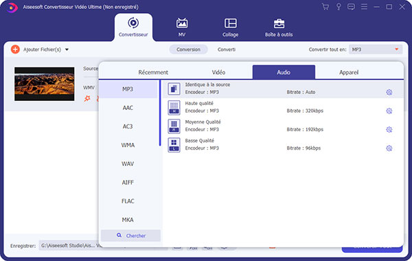 Après avoir exporté un fichier de projet MSWMM en format WMV, vous pouvez utiliser Aiseesoft Convertisseur Vidéo Ultime pour convertir MSWMM en MP3. Aiseesoft Convertisseur Vidéo Ultime est un convertisseur vidéo et audio professionnel qui supporte un grand nombre de formats, tels que WMV, MP3, FLAC, OGG, MP4, AVI, FLV, TS, MOV, MKV, etc. Maintenant, suivez les étapes ci-dessous pour convertir MSWMM en MP3.