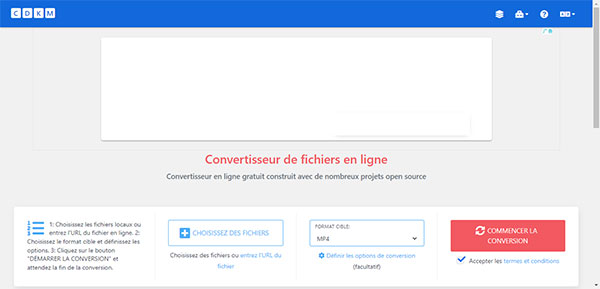 Un deuxième convertisseur MPG en MP4 en ligne qui s'adapte aux écrans de petite taille, se trouve sur la page web de CDKM. C'est en fait un convertisseur généraliste, qui peut convertir de MPG vers MP4, mais pas de MP4 vers MPG.