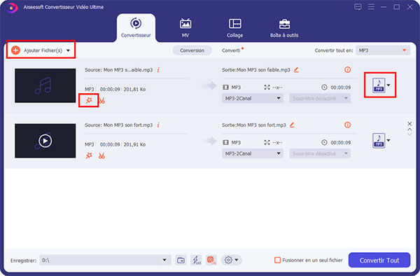 Bien sûr Aiseesoft Convertisseur Vidéo Ultime est avant tout un convertisseur multimédia de très haute qualité et qui connaît un grand nombre de formats multimédia (MP3, MP4, AAC, MOV, M4A, WMV, AVI, OGG, OGV, etc.). Cependant, il a aussi des outils pour améliorer et éditer les fichiers multimédias, dont un pour ajuster le volume audio. L'idée est donc de convertir votre MP3 en un MP3, dont le volume a été normalisé/égalisé. Vous pourrez même vérifier le résultat de l'égalisation avant de convertir.