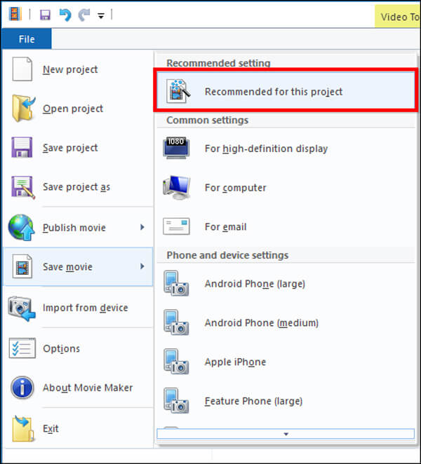 Affichez la vidéo sur Windows Movie Maker pour vous assurer que vous avez obtenu un effet souhaité. Si vous êtes satisfait du résultat, cliquez sur le menu "Fichier", dépliez le menu "Enregistrer le film" et choisissez un appareil cible. Windows Movie Maker transcodera et enregistrera la vidéo pivotée pour la lecture sur ordinateur, iPhone, téléphone Android automatiquement et dans différentes qualités vidéo.