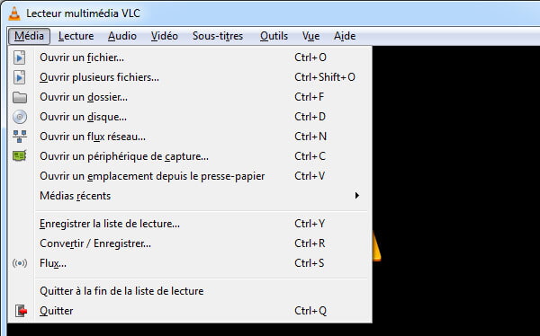Étape 1 Lancez le lecteur multimédia VLC, cliquez sur le bouton Média, puis sélectionnez l'option Ouvrir un fichier.