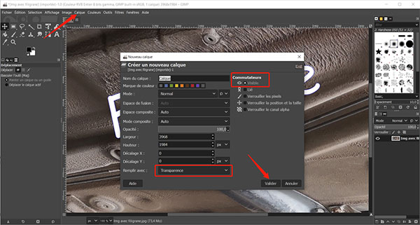 Ouvrez le menu "Calque > Nouveau calque…". Assurez-vous que la liste "Remplir avec" est bien réglée sur "Transparence" et que "Commutateur" "Visible" est coché. Enfin, cliquez sur Valider.