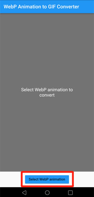 Ouvrez l'application sur le smartphone et cliquez sur Select WebP animation pour aller chercher le fichier à convertir.