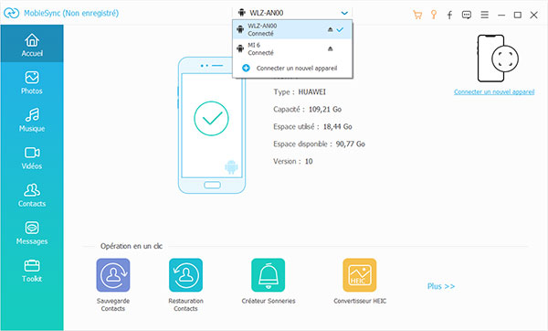 - Effectuer le transfert de données entre l'appareil et PC ou entre deux appareils, y compris Android vers Android, iOS vers Android/Android vers iOS, iOS vers iOS.